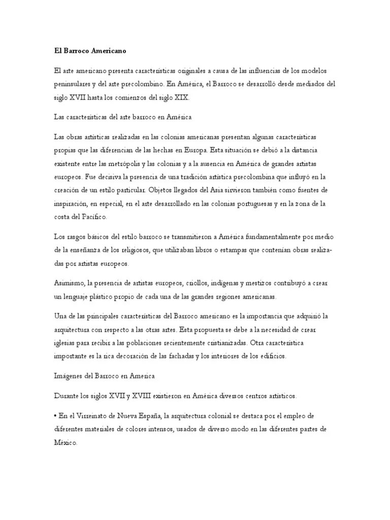 Pero esta ultima es dotada de elementos autóctonos y sincretismo religioso local en forma mas marcada... Las características del arte barroco en américa. Artistas barrocos miércoles, 20 de febrero de 2013. Los artistas indios y mestizos se guían por su propia sensibilidad y trasladan al lienzo su mentalidad y su manera vernácula de concebir el mundo. Temas de genero, del diario vivir se desarrollan junto con la tradicional pintura religiosa; En américa, el barroco se desarrolló desde mediados del siglo xvii hasta los comienzos del siglo xix. El arte americano presenta características originales a causa de las influencias de los modelos peninsulares y del arte precolombino. Pero esta ultima es dotada de elementos autóctonos y sincretismo religioso local en forma mas marcada.. La intensidad e inmediatez, el individualismo y el detalle del arte barroco, manifestando en las representaciones realistas de la piel y las ropas, hicieron de él uno de los estilos más arraigados del arte occidental.